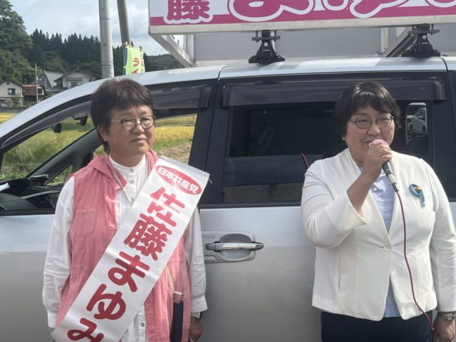 2期目目指す#佐藤真由美 さんの第一声で訴えました。パワフルで地域のために頑張った4年間。放課後子ども教室の開設日も増やしました。農家の飼料代補助など実現。地元後援会からの応援が、味があっていいなぁと思いました。