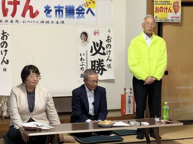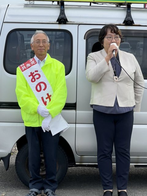 おのけん予定候補は、元東由利町議から合併特例で市議一期。8市町が合併したのに議員定数は合併前の旧本荘市24人より少ない22人!本来なら議員を一緒にやっているべき人。でも地区委員長として佐々木隆一市議を支え、市民のために一緒に頑張ってきた方と訴えました。佐々木隆一市議と。