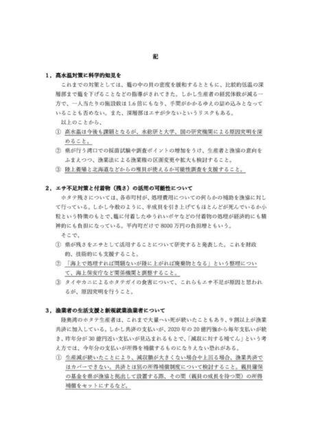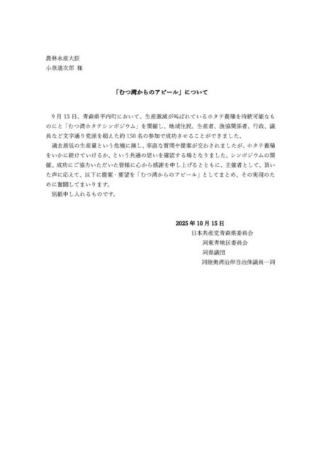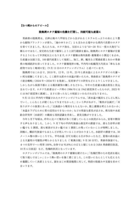 「むつ湾からのアピール」先月13日のホタテシンポうけ、改めて決意と提案をまとめ、水産庁の信夫隆生次長に届けました。岩渕友参院議員。安藤晴美、吉俣洋、田端みゆき各県議、赤平勇人青森市議、沖津正博横浜町議。政府は高水温耐性のあるホタテ開発に予算、と昨日東奥日報に。