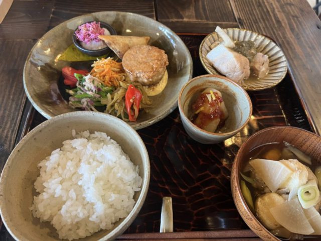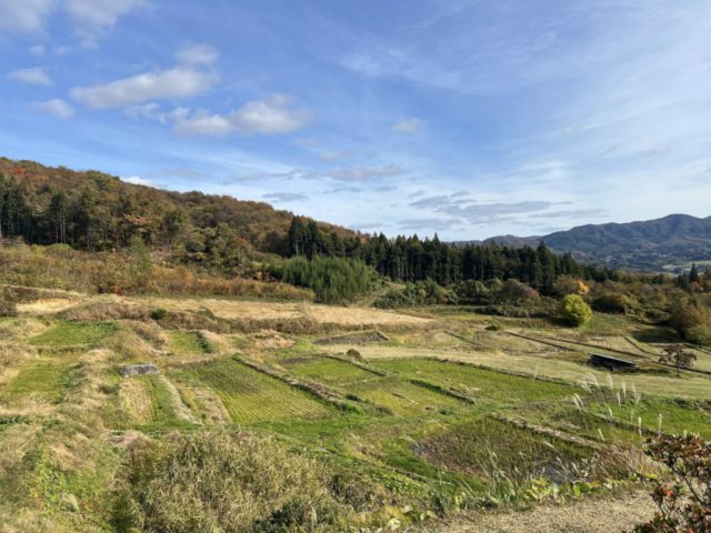 お昼は岩手県旧大東町山吹地区の古民家カフェ。女性たちでいっぱい!棚田百選に選ばれた棚田が目の前にあるんだけど、耕作放棄地も多く、、