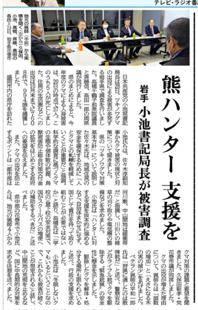 昨日のクマ被害対策調査。#小池晃 書記局長、岩手県議団と.岩手県庁、花巻市のハンター皆さん、盛岡市内で出没の多い商店街、住宅団地の皆さんとの懇談も行いました。