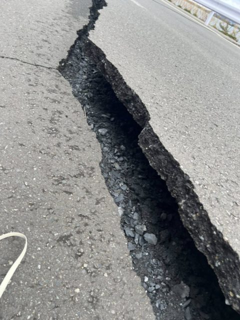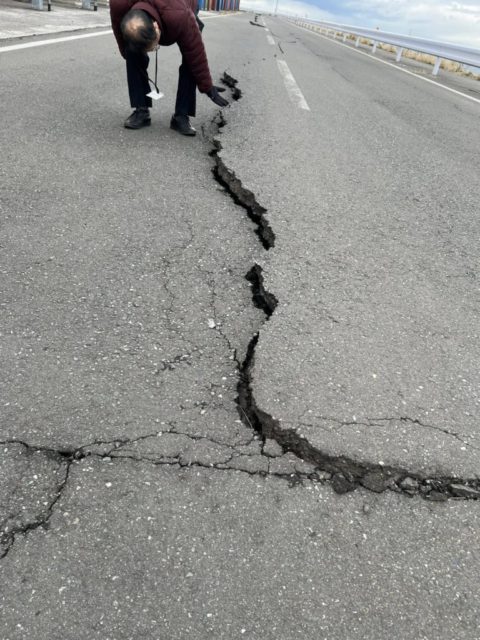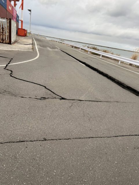 ④ #八戸港コンテナターミナル 国際物流拠点であり、被災したのは埋立し拡張したヤード。作業員など一般車が走る道路に縦に地割れが。カラ状態で4トン、荷物入れば25トンにもなるコンテナが並ぶ地盤に段差が!コンテナを運びだせるかは重機の重さに地盤が耐えられるか、調査中と、、