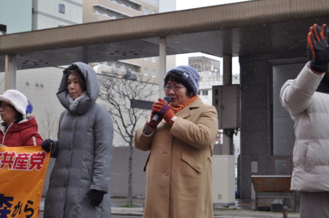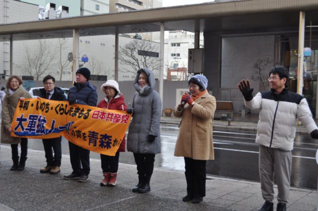 雪がふりはじめ、寒い日になりました。毎年恒例の仕事納めの県・市議団と街頭宣伝。吉俣洋青森県議、村川みどり、万徳なお子、天内慎也、赤平勇人各青森市議と。