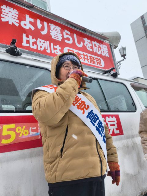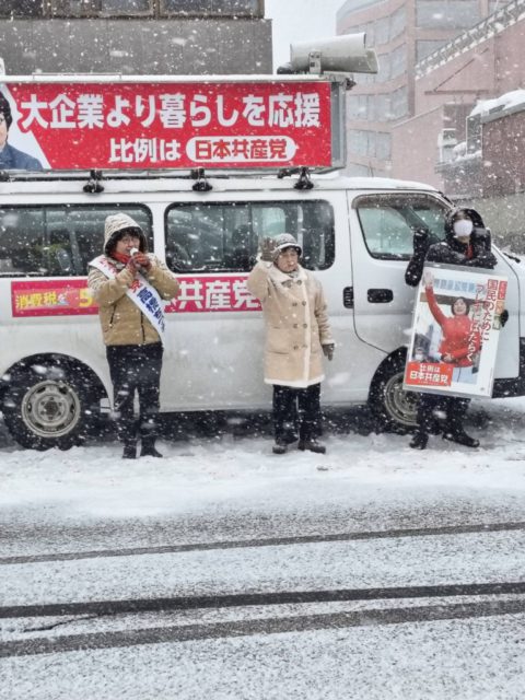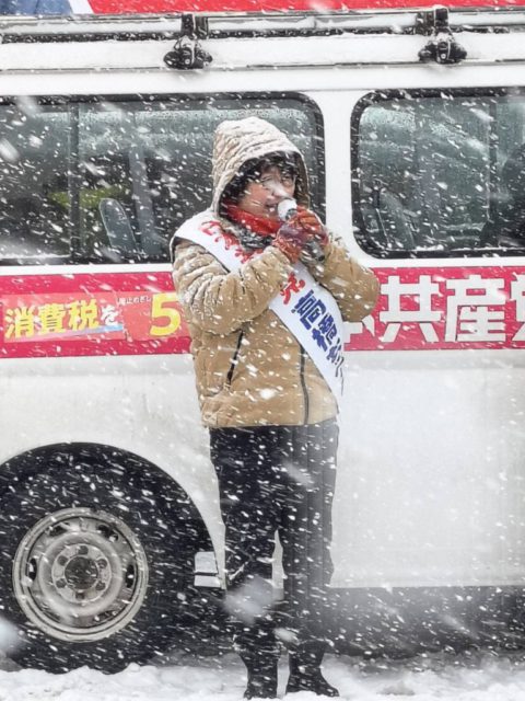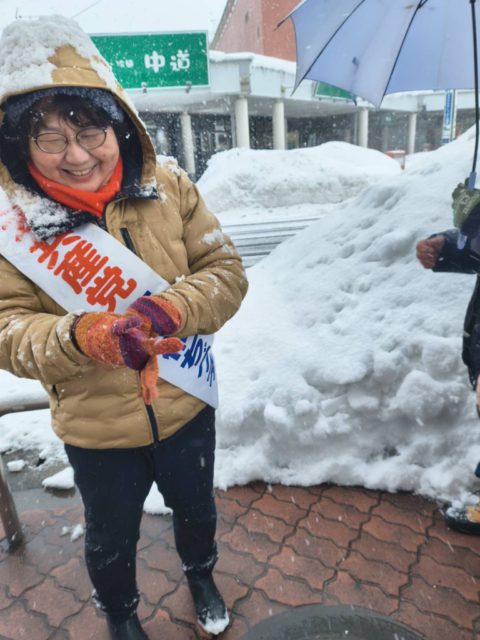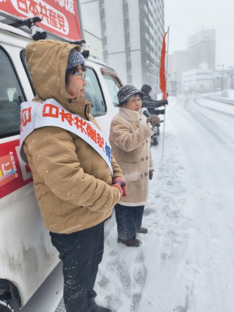 弘前市②青森県が昨年に続き災害救助法を適用しました。豪雪の際の除排雪予算の増額、代行除雪、雪害でつぶれたパイプハウスの再建など、さまざまとりくんできた、「声大変だね.でも気迫が伝わった」と若い皆さんに激励されて感激。