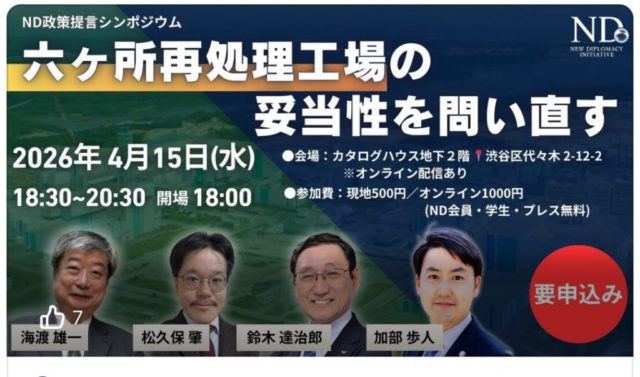 4. 夜は都内で猿田佐世弁護士が代表のND(新外交イニシャティブ)主催の #六ヶ所再処理工場 問題シンポジウムにリアル参加。原子力政策に関する当時の原子力委員だった鈴木達次郎先生、サイクル、もんじゅ、原発訴訟などにずっととりくんできた海渡雄一弁護士、コスト論を解明した原子力資料情報室の松久保肇氏など、豪華メンバーで2時間!