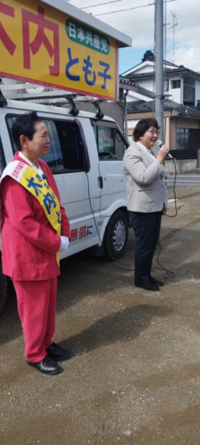 #宮城県大崎市議選。 定数28に対し2人はみだしの大激戦。日本共産党は新人2人含め4議席必勝! #かまうち克美 候補は、医療、介護の現場で活躍してきたひと。暮らし守る活躍に期待!1万の市民署名「学校給食無償化」を共産党以外は反対。でも国も動いて4月から小学校で実現。今度は中学校も!